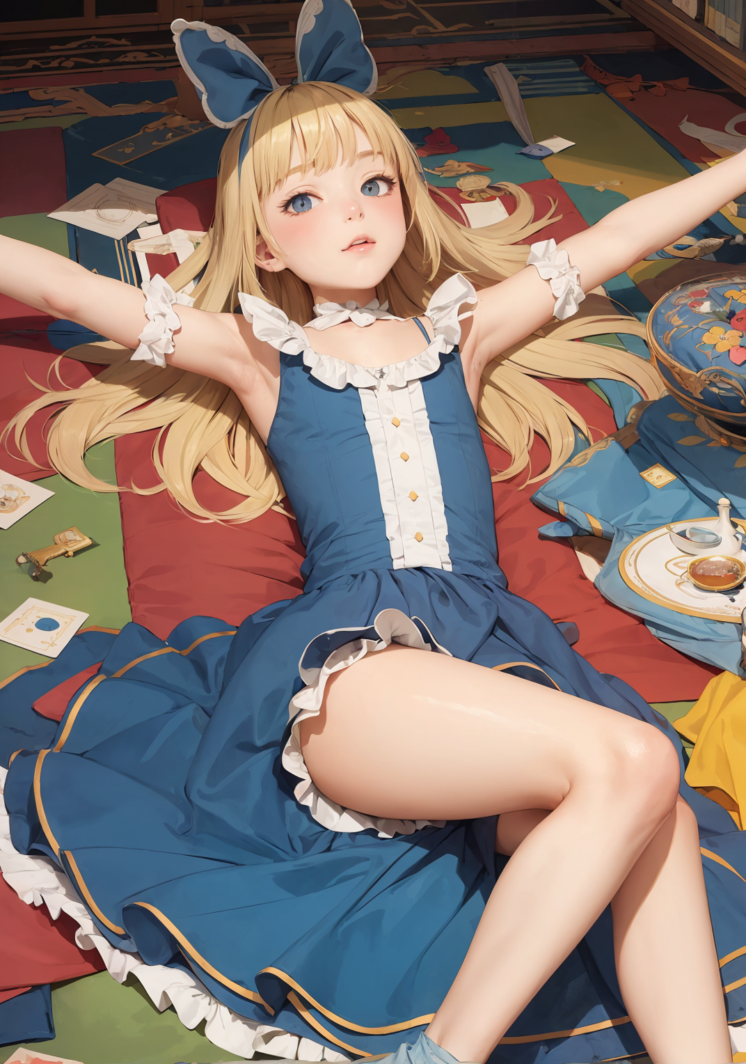 不思議の国のアリス風美少女 Part3 Illustration Gallery X Facebook はてブ LINE コピー 2024.03.11 不思議の国のアリス風の美少女が横たわっているAIイラストをStable Diffusionで生成しました。衣装はエプロンドレスっぽくはないのですが、水色~青を基調としたロリータファッション風のかわいいコスチュームとなっています。英国のお嬢様のようですね。大きめのリボンもとってもKawaiiです。ちなみにコスチュームのプロンプトは「alice in wonderland」のみです。素晴らしい!