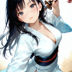 現実世界ではおそらく交わることのないであろう日本刀とスクール水着。スクール水着のみの着用で刀を持っているイラストは若干ミスマッチ感ありますが、スク水の上に着物っぽいものを羽織るとたちまち違和感なく馴染んできます。やはり日本刀には着物とか和服が似合うという事なのでしょうか。